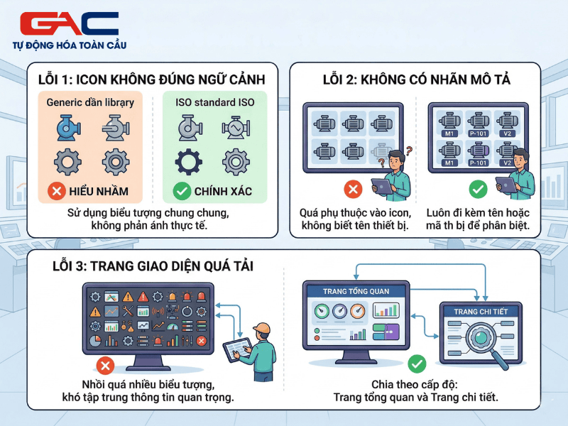 Trước hết là dùng icon không đúng ngữ cảnh kỹ thuật. Một số biểu tượng lấy từ thư viện chung có thể đẹp nhưng không phản ánh chính xác đối tượng công nghiệp, dẫn đến hiểu nhầm khi vận hành.