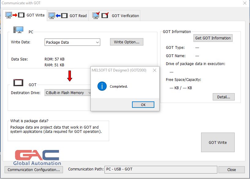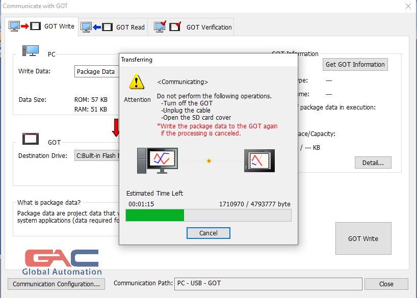 – Tiếp theo hộp thoại xuất hiện, chọn “GOT Write” để download chương trình xuống HMI. Khi hộp thoại cảnh báo xuất hiện => Chọn Yes để bắt đầu