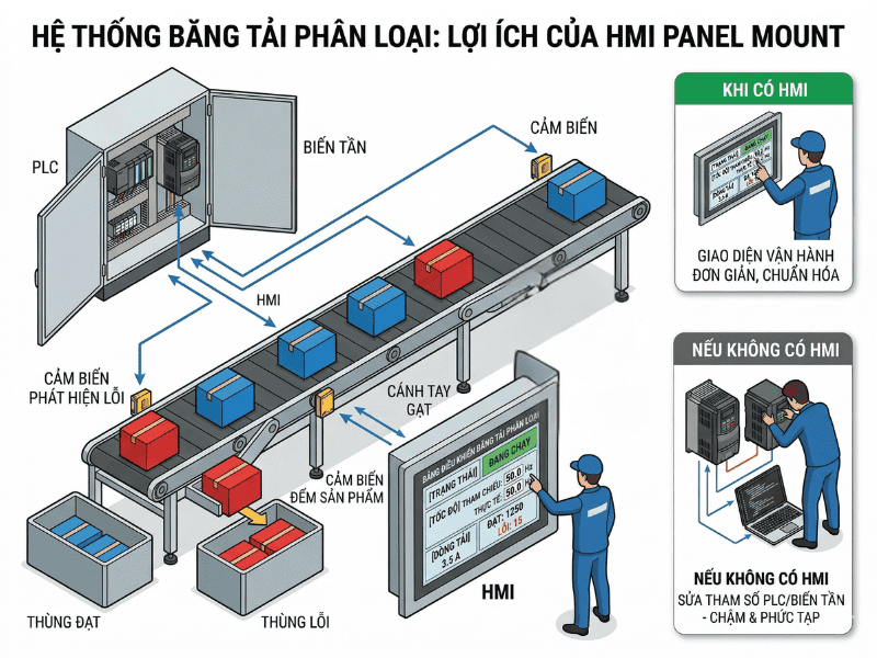 Một ví dụ điển hình là hệ thống băng tải phân loại sản phẩm. PLC xử lý tín hiệu cảm biến và quyết định logic phân loại. Biến tần điều khiển tốc độ động cơ băng tải. HMI panel mount cho phép kỹ thuật viên nhập tốc độ tham chiếu, xem dòng tải, số lượng sản phẩm đạt lỗi và trạng thái chạy dừng.