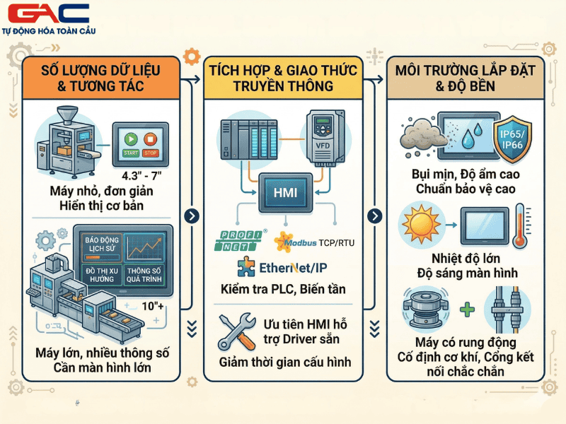 Trước tiên cần xác định số lượng dữ liệu cần hiển thị và mức độ tương tác. Với máy nhỏ, màn hình 4.3 inch hoặc 7 inch có thể đủ. Nhưng nếu có nhiều trang giám sát, nhiều thông số công nghệ hoặc cần hiển thị đồ thị, alarm history, trend thì nên chọn màn hình lớn hơn. Tiếp theo là kiểm tra giao thức truyền thông của PLC và biến tần. Nếu hệ thống đang dùng thiết bị phổ thông trong ngành máy, nên ưu tiên HMI hỗ trợ driver sẵn để giảm thời gian cấu hình.