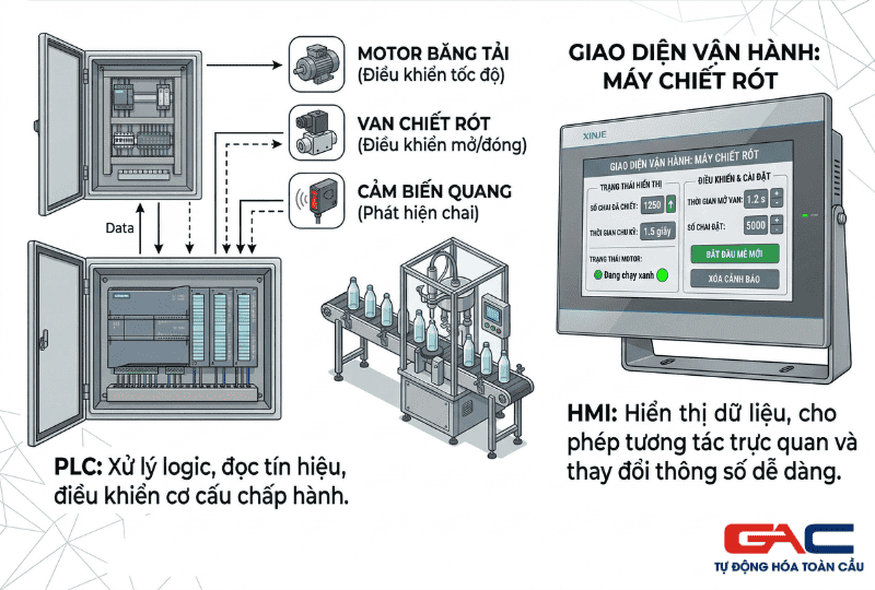 Ví dụ thực tế, với một máy chiết rót, PLC điều khiển trình tự van, motor và cảm biến mức. HMI sẽ hiển thị số chai đã chiết, thời gian chu kỳ, trạng thái motor, đồng thời cho phép kỹ thuật viên nhập thời gian mở van, số lượng mẻ hoặc đặt lại cảnh báo. Điều này giúp tối ưu thời gian chỉnh máy và giảm phụ thuộc vào việc sửa code PLC cho các thay đổi nhỏ.