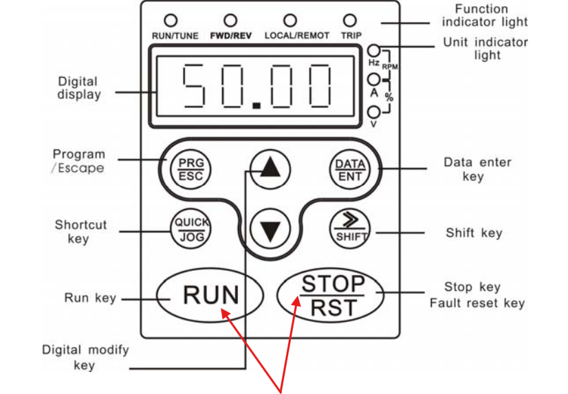 - Giá trị cài đặt 0: Lệnh chạy/dừng sẽ được nhận từ bàn phím trên biến tần (thông qua phím RUN/STOP).