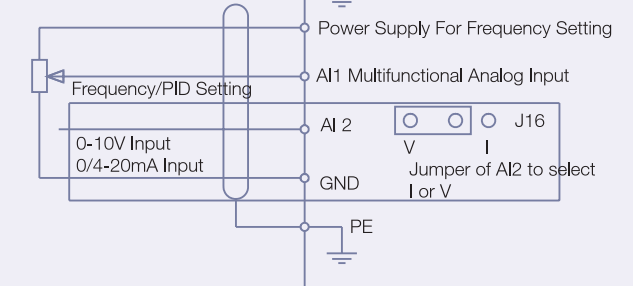 - 1: Cài đặt bằng kênh AI1. Giá trị tần số chạy được điều khiển bởi ngõ vào analog, AI1 là ngõ vào điện áp từ -10V~10V.
