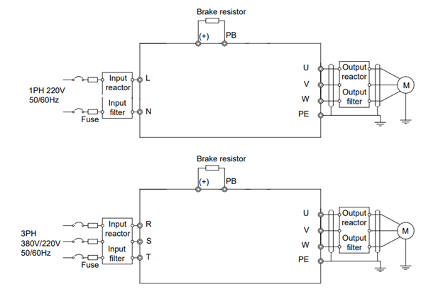 - Nguồn cấp (Input): Kết nối nguồn điện vào các chân R, S, T (đối với 3 pha) hoặc L, N (đối với 1 pha).
