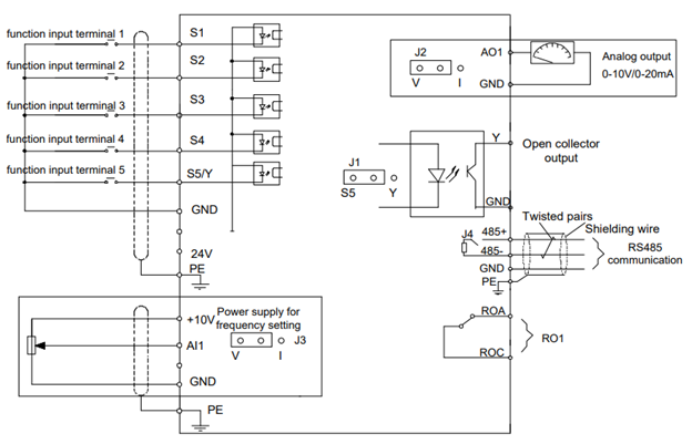 - Ngắt kết nối cả S1 và S2: Biến tần giảm tốc dừng.