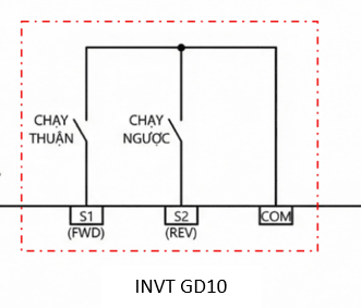 Để chạy thuận/nghịch bằng công tắc chuyển mạch hoặc nút nhấn (chế độ 2 dây), bạn cần cấu hình lại chân S2 (vì mặc định S2 là chạy Nhấp – Jogging).