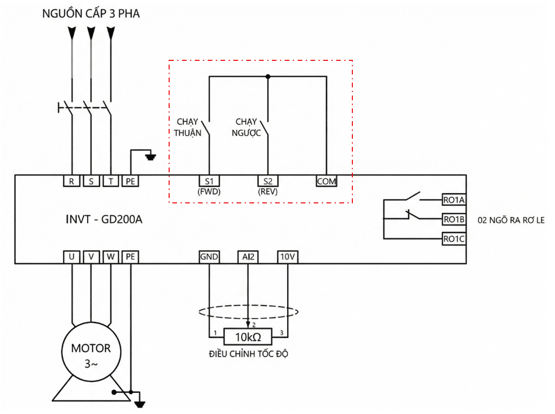 Việc cài đặt biến tần INVT GD200A cần tuân thủ đúng trình tự kỹ thuật: nhập thông số động cơ, lựa chọn chế độ điều khiển, thiết lập kênh chạy/dừng, cấu hình tần số và thời gian tăng/giảm tốc, sau đó thiết lập giới hạn và bù mô-men. Khi được cấu hình chính xác, biến tần sẽ vận hành ổn định, bảo vệ tốt động cơ và đáp ứng đầy đủ yêu cầu điều khiển trong các hệ thống công nghiệp.
