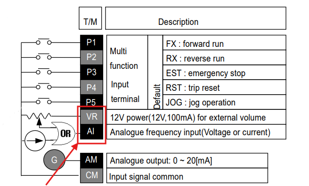 - P1, P2: Các chân đầu vào đa chức năng (Mặc định P1 là chạy thuận FX, P2 là chạy nghịch RX hoặc Reset tùy cài đặt).