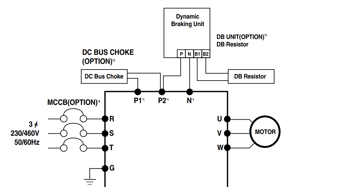 - Chân B1, B2: Dùng để gắn điện trở xả. Thường dùng cho các ứng dụng có quán tính lớn hoặc cần dừng nhanh (như cẩu trục, thang hàng).