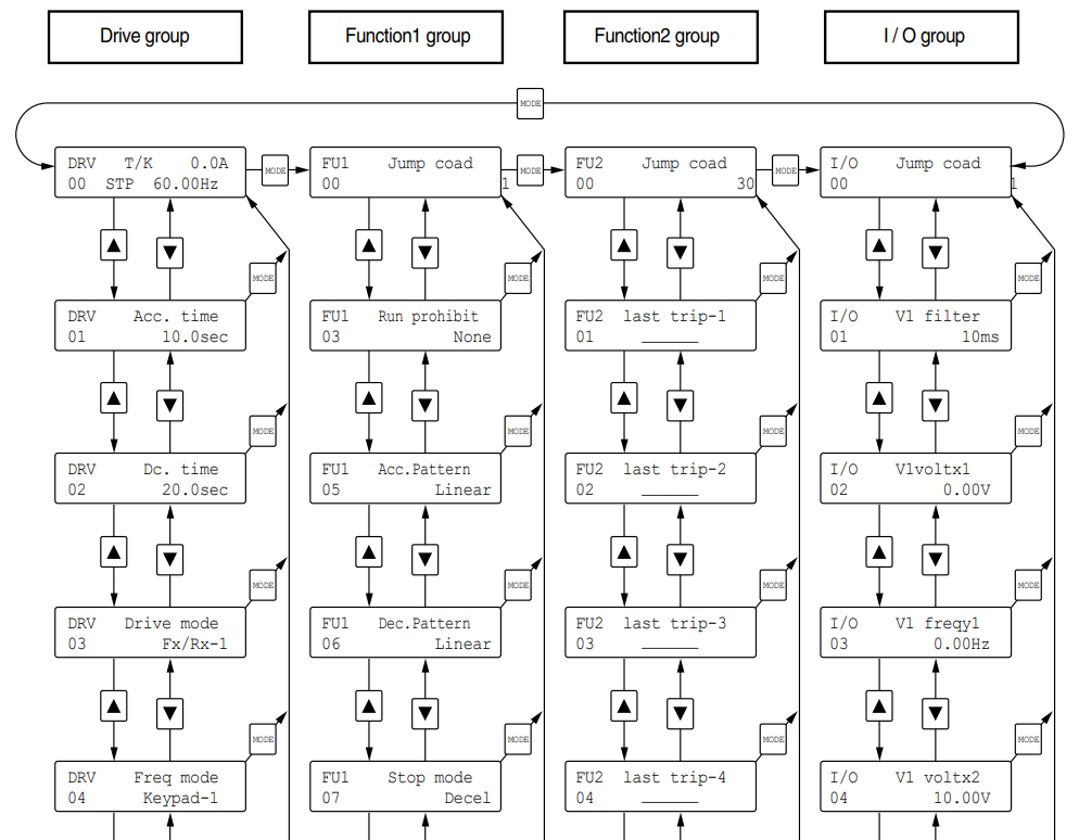 - MODE: Dùng để chuyển đổi giữa các nhóm thông số (Drive group, Function group 1, Function group 2, I/O group).