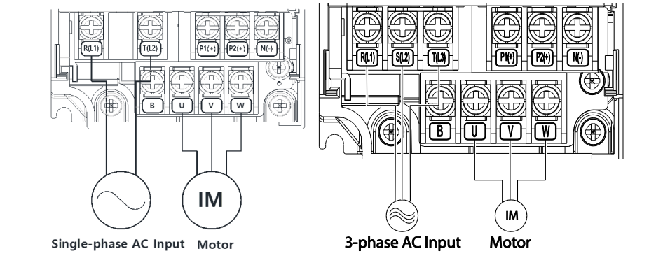 • Nguồn vào: Đấu vào các chân R, S, T (đối với dòng 3 pha 380V) hoặc L1, L2 (đối với dòng 1 pha 220V). Tuyệt đối không được nhầm lẫn đưa nguồn vào chân ngõ ra.