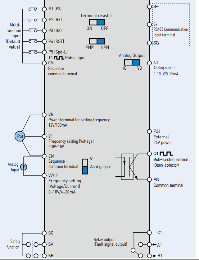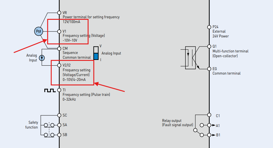 • Chiết áp (Analog Input): Sử dụng chân VR (nguồn 12V), V1 (tín hiệu -10V – 10V) và CM (0V). Chân V1 dùng để điều chỉnh tần số bằng biến trở ngoài.