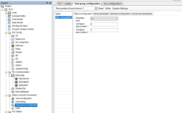 Tại cây thư mục Project, tìm đến thư mục Axis Group Configuration để cấu hình số trục chuyển động