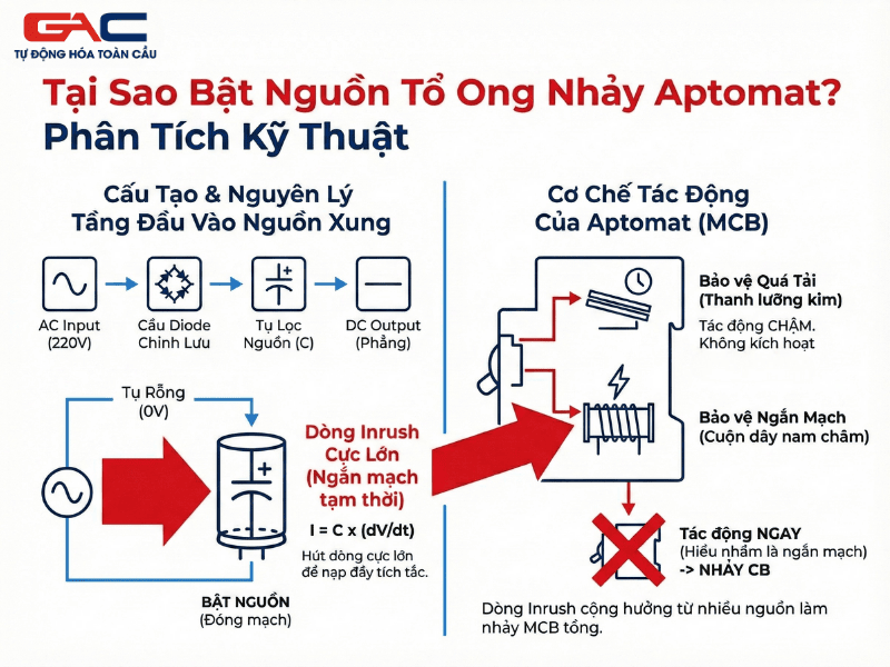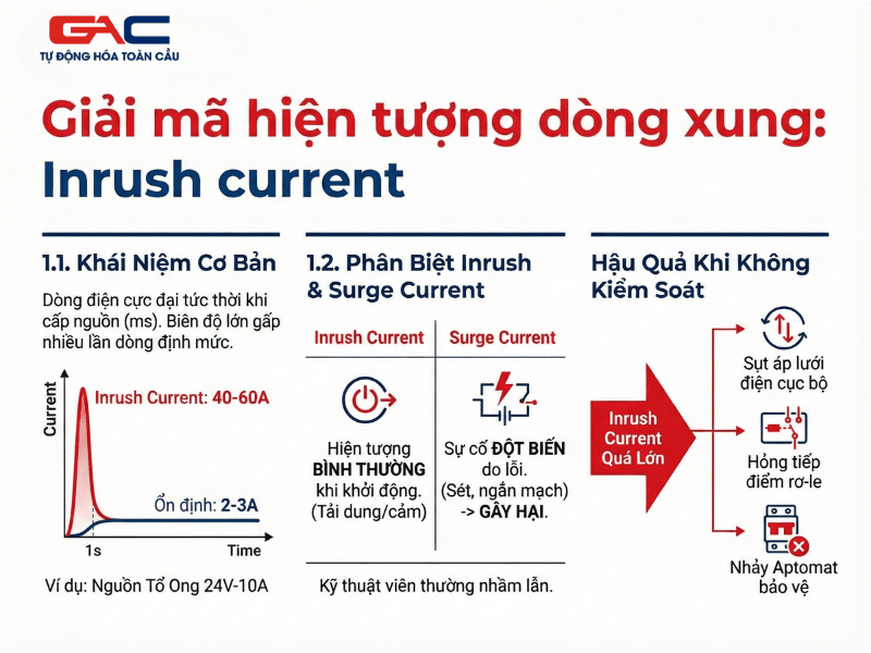 Inrush Current là gì? Tìm hiểu nguyên nhân bật nguồn tổ ong nhảy Aptomat và giải pháp khắc phục hiệu quả. Khám phá bộ nguồn GAC chất lượng cao, chống nhiễu tại Tự Động Hóa Toàn Cầu.
