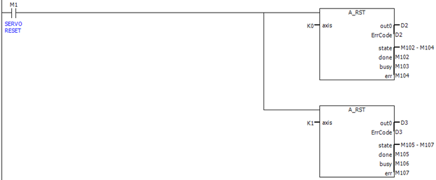 M10,M11: Các bit đầu vào kích hoạt lệnh A_RST cho trục 0 và trục 1 tương ứng.D100,D102: Thanh ghi để lưu mã lỗi (ErrCode) cho trục 0 và trục 1.M200,M203: Các bit trạng thái cho quá trình thực thi lệnh (Done/Busy/Error) của trục 0 và trục 1.K0,K1: Chỉ định trục 0 và trục 1.