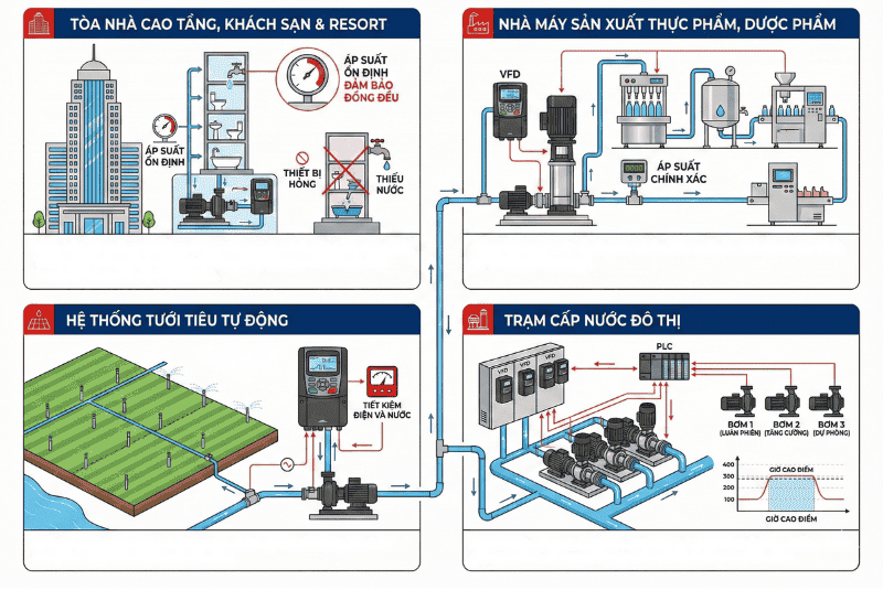 - Trạm cấp nước đô thị: Điều khiển các cụm bơm lớn hoạt động luân phiên và tăng cường theo giờ cao điểm để duy trì áp lực mạng lưới đường ống ổn định.