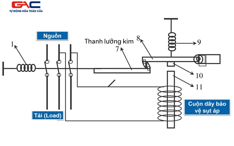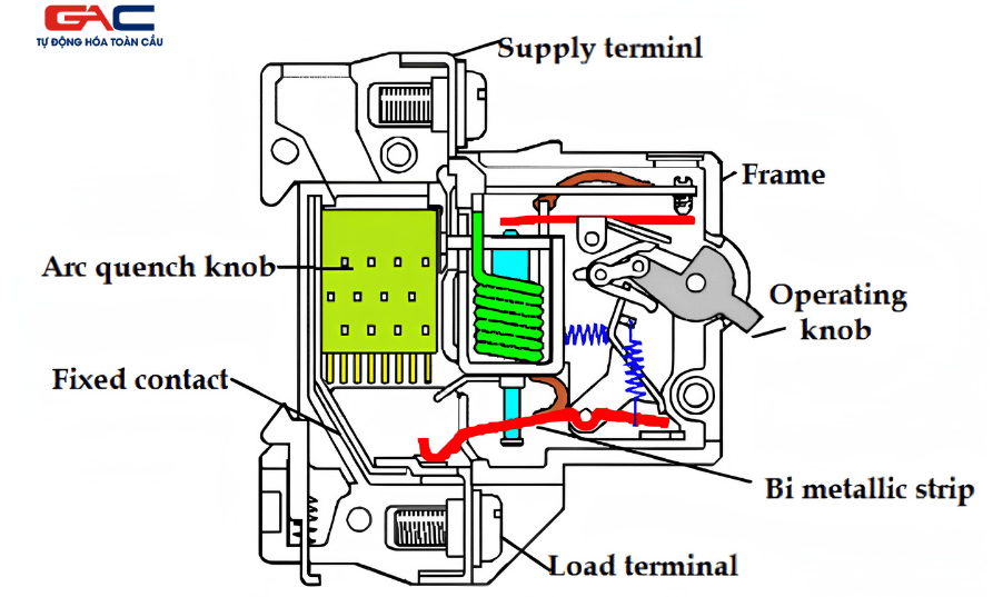Về nguyên lý, MCB thường có 2 cơ chế bảo vệ. Cơ chế nhiệt dùng để phát hiện quá tải. Khi dòng điện vượt mức định mức trong một thời gian, thanh lưỡng kim bên trong bị nóng và cong, từ đó kích hoạt cơ cấu ngắt. Cơ chế từ dùng để phát hiện ngắn mạch. Khi dòng sự cố tăng đột ngột, cuộn từ sinh lực hút mạnh làm MCB nhảy gần như tức thời.