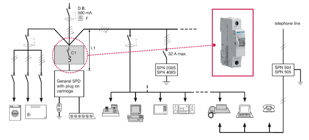 MCB Hager dùng để đóng cắt và bảo vệ từng nhánh điện như chiếu sáng, ổ cắm, nguồn điều khiển, nguồn cấp cho thiết bị điện trong tủ điện.