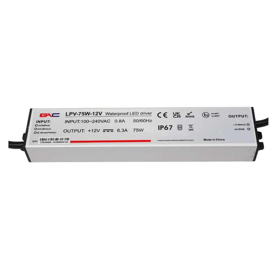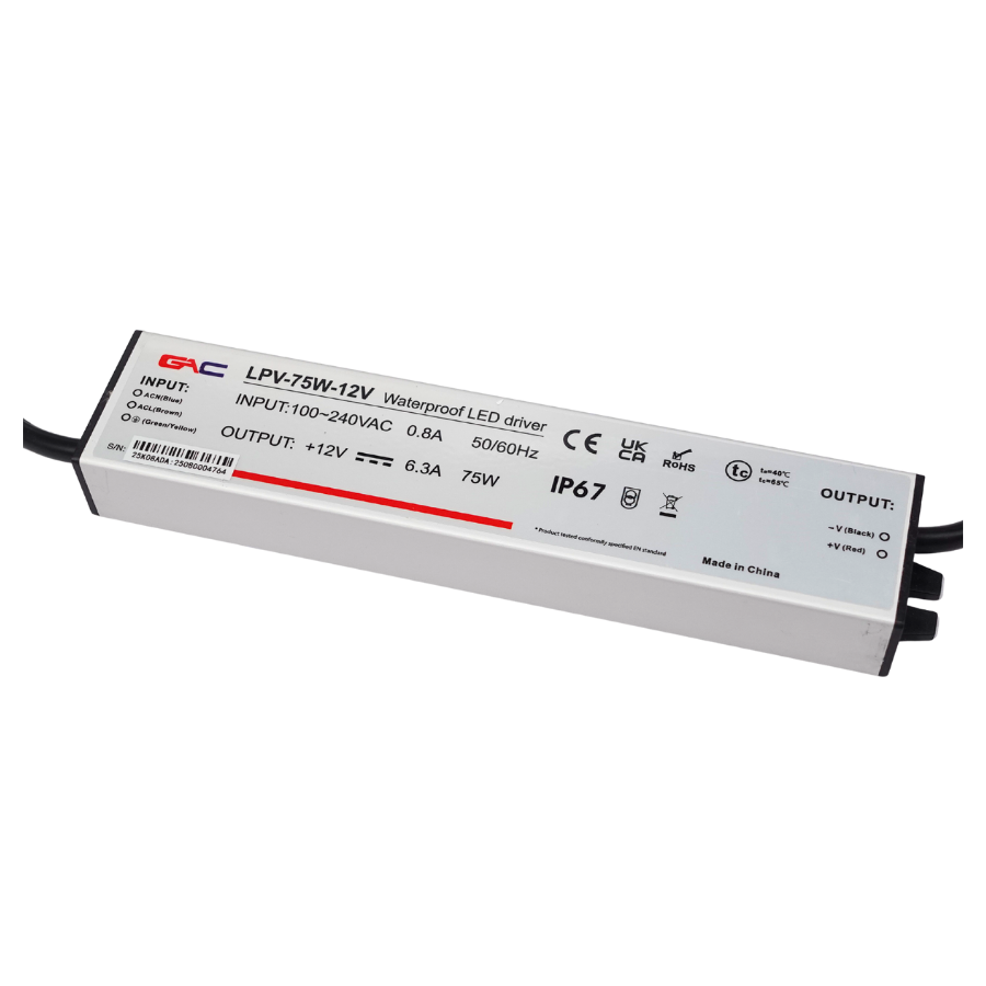 Nguồn đèn LED chống nước GAC – LPV-75W-12V là nguồn chuyển đổi điện AC thành DC cho đèn LED, với lớp vỏ nhôm đúc kín và mạch bên trong phù hợp cho các ứng dụng chiếu sáng ngoài trời như đèn quảng cáo, bảng hiệu, LED dây và các dải LED trang trí.
