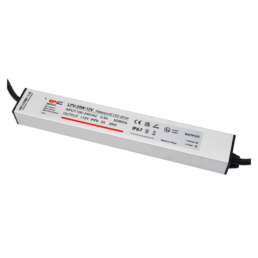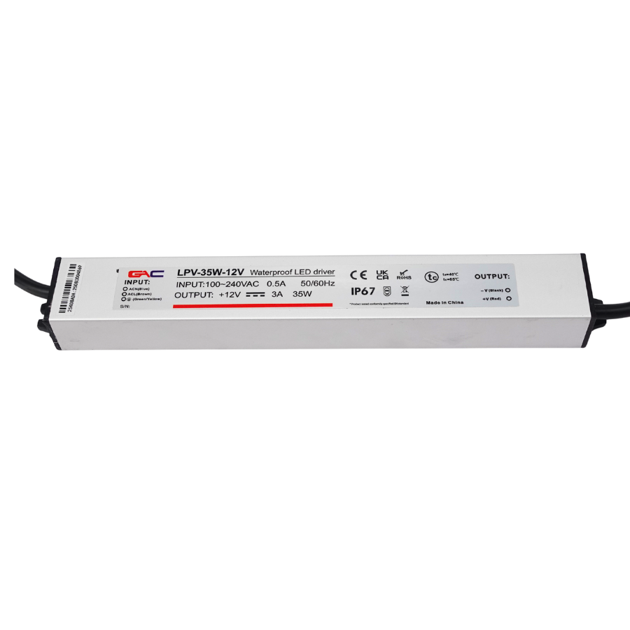 Nguồn đèn LED chống nước GAC – LPV-35W-24V là nguồn chuyển đổi điện AC thành DC cho đèn LED, với lớp vỏ nhôm đúc kín và mạch bên trong phù hợp cho các ứng dụng chiếu sáng ngoài trời như đèn quảng cáo, bảng hiệu, LED dây và các dải LED trang trí.
