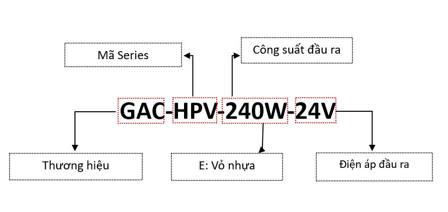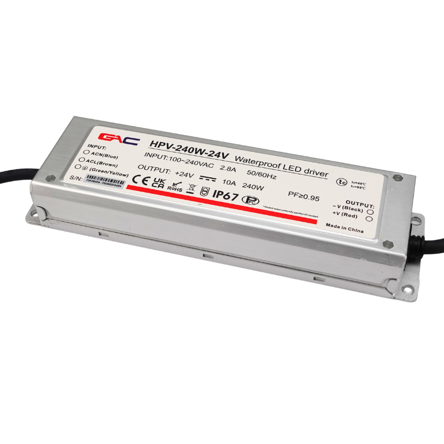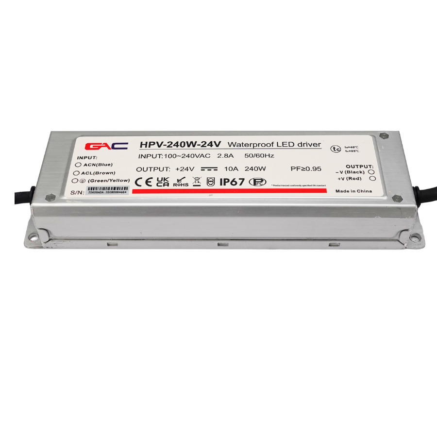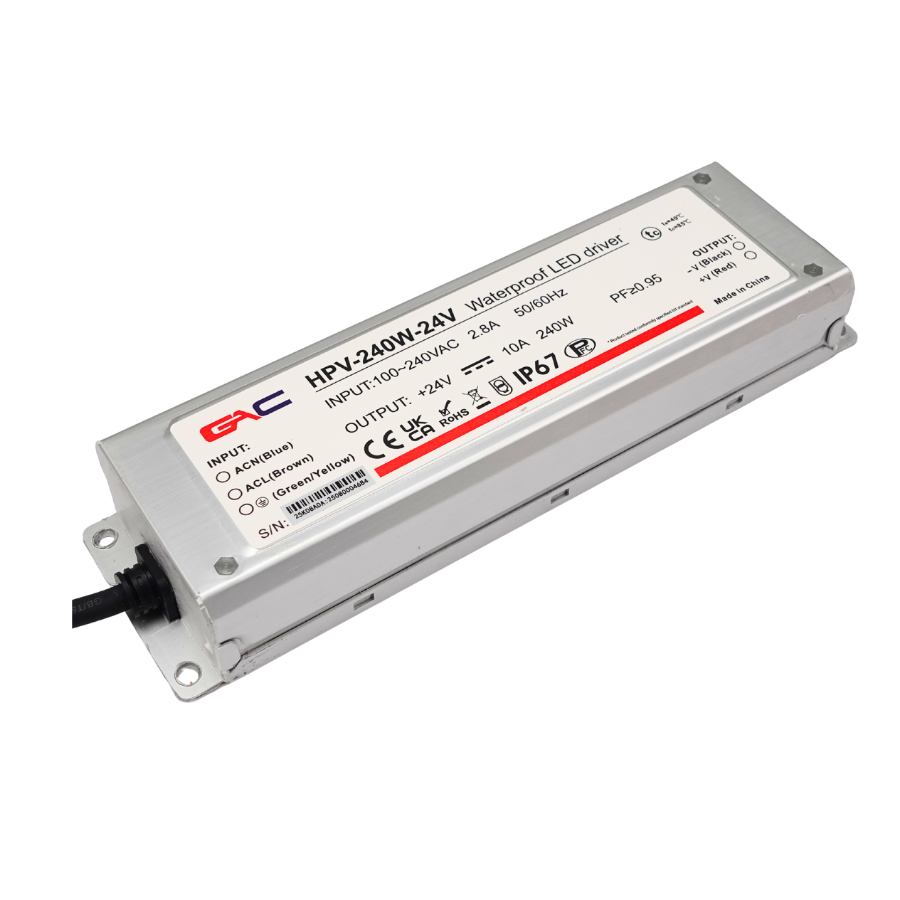 Nguồn đèn LED chống nước GAC – HPV-240W-24V là nguồn chuyển đổi điện AC thành DC cho đèn LED, với lớp vỏ nhựa kín và mạch bên trong phù hợp cho các ứng dụng chiếu sáng ngoài trời như đèn quảng cáo, bảng hiệu, LED dây và các dải LED trang trí.