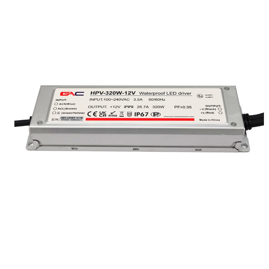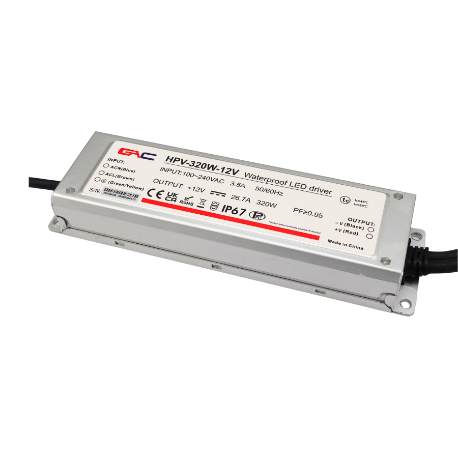 Nguồn đèn LED chống nước GAC – HPV-320W-12V là nguồn chuyển đổi điện AC thành DC cho đèn LED, với lớp vỏ nhựa kín và mạch bên trong phù hợp cho các ứng dụng chiếu sáng ngoài trời như đèn quảng cáo, bảng hiệu, LED dây và các dải LED trang trí.