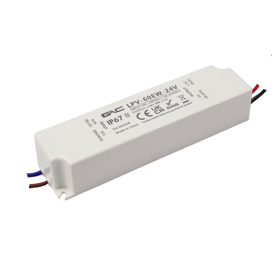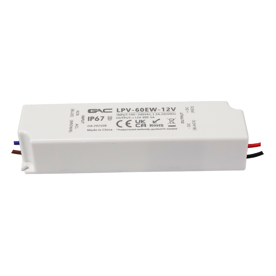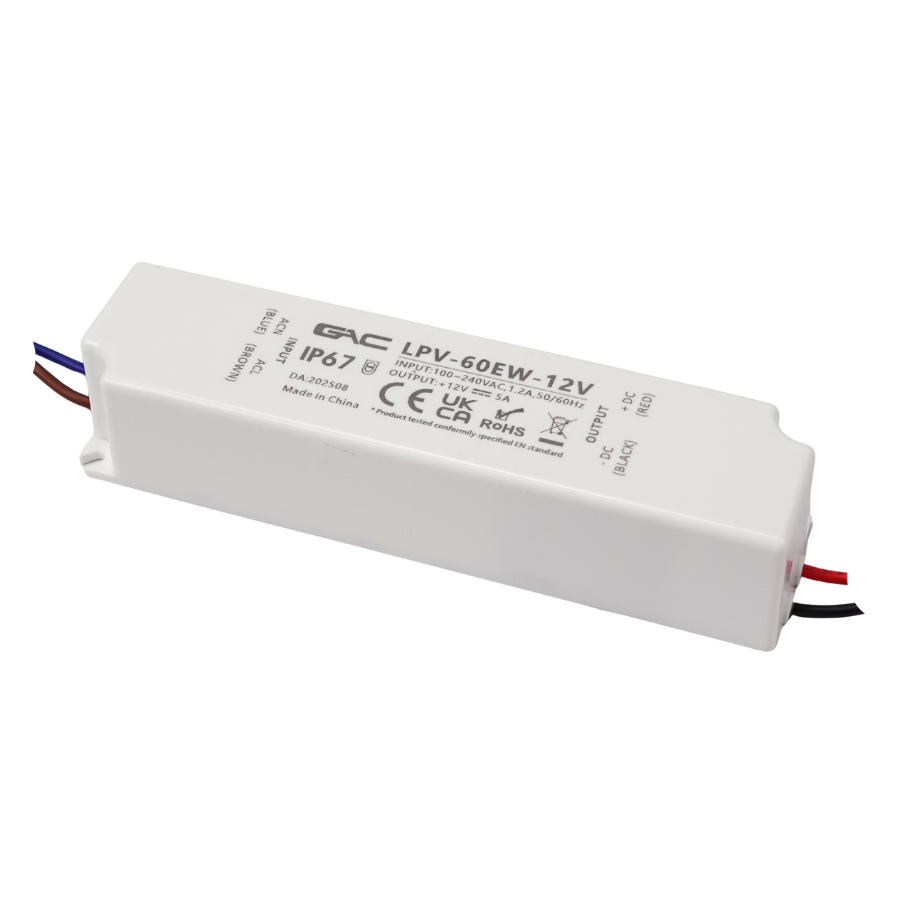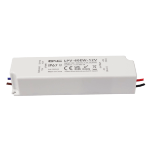 Nguồn đèn LED chống nước GAC – LPV-60EW-12V là nguồn chuyển đổi điện AC thành DC cho đèn LED, với lớp vỏ nhựa kín và mạch bên trong phù hợp cho các ứng dụng chiếu sáng ngoài trời như đèn quảng cáo, bảng hiệu, LED dây và các dải LED trang trí.