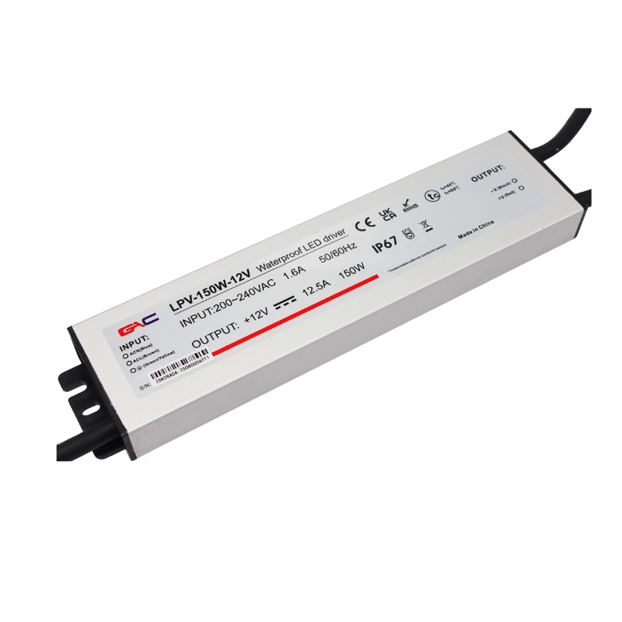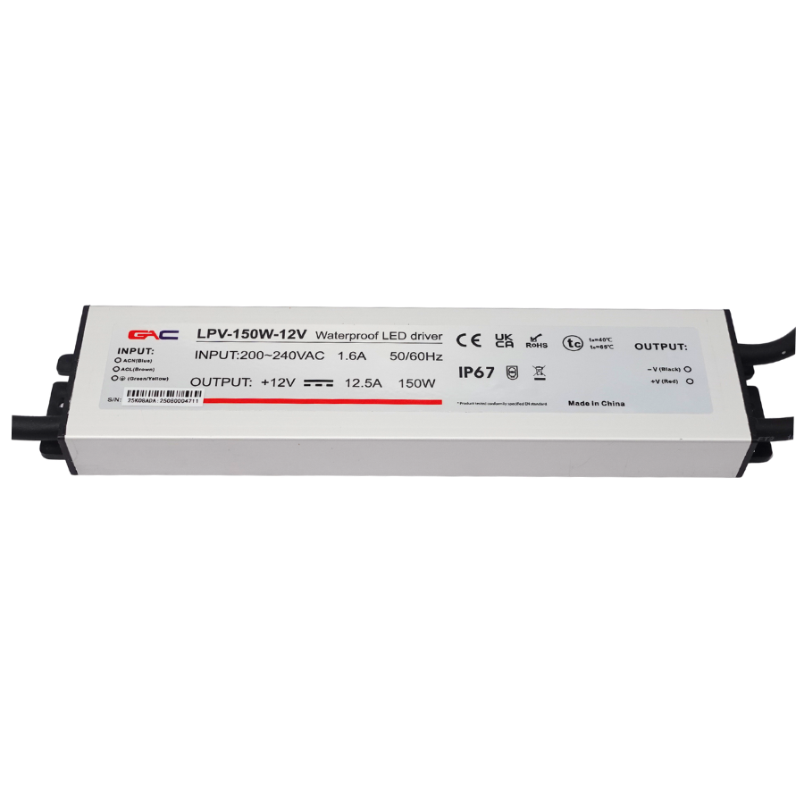 Nguồn đèn LED chống nước GAC – LPV-150W-24V là nguồn chuyển đổi điện AC thành DC cho đèn LED, với lớp vỏ nhôm đúc kín và mạch bên trong phù hợp cho các ứng dụng chiếu sáng ngoài trời như đèn quảng cáo, bảng hiệu, LED dây và các dải LED trang trí.