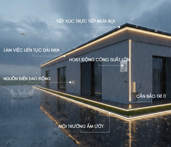 Đèn LED ngoài trời phải hoạt động ổn định trong môi trường nhiều biến động như nhiệt độ cao, mưa ẩm, bụi bẩn hoặc dao động điện áp, do đó bộ nguồn cần đáp ứng đồng thời cả yêu cầu kỹ thuật lẫn thiết kế bảo vệ sau: