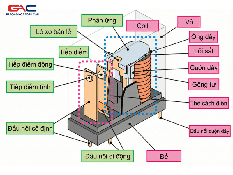 Bên trong mỗi điểm ngõ ra của bộ điều khiển, nhà sản xuất sẽ bố trí một rơ-le điện từ siêu nhỏ. Cấu trúc của linh kiện này bao gồm hai phần tách biệt hoàn toàn về mặt điện học. Phần thứ nhất là cuộn dây điện từ, được điều khiển trực tiếp bởi vi xử lý trung tâm thông qua mức điện áp thấp, thường là 5V DC hoặc 24V DC. Phần thứ hai là các tiếp điểm cơ khí, bao gồm tiếp điểm thường mở và tiếp điểm thường đóng, được chế tạo từ các hợp kim đặc biệt có khả năng chống mài mòn và chịu được hồ quang điện.