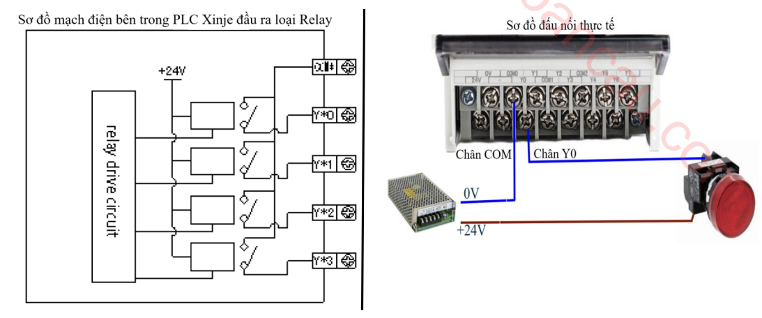 Nếu tải của bạn là bóng đèn hoặc khởi động từ chạy điện xoay chiều 220V AC, bạn đưa dây Lửa vào chân COM, chân Y nối với một đầu cuộn dây khởi động từ, đầu còn lại của cuộn dây nối về dây Nguội. Tương tự đối với mạch một chiều, bạn có thể sử dụng các thiết bị cấp nguồn công nghiệp chuyên dụng như nguồn tổ ong hoặc nguồn gắn thanh ray để cấp điện áp 24V DC ổn định. Việc phân nhóm chân COM cho phép bạn đấu nối Y0, Y1 điều khiển tải AC, trong khi cụm Y2, Y3 ở một chân COM khác lại điều khiển tải DC mà không gây chập cháy.