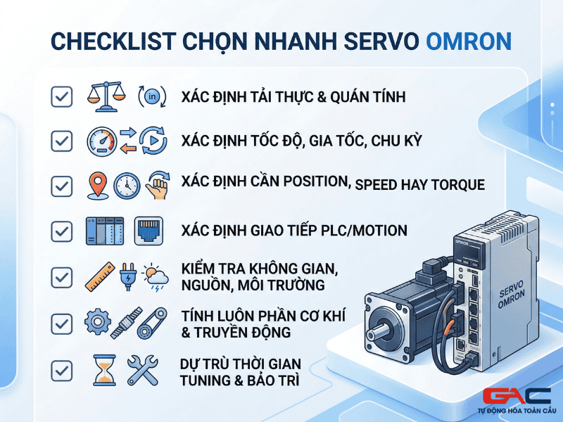 Chọn servo Omron đúng không nên bắt đầu từ câu hỏi “mua bao nhiêu kW”, mà phải bắt đầu từ bài toán chuyển động.