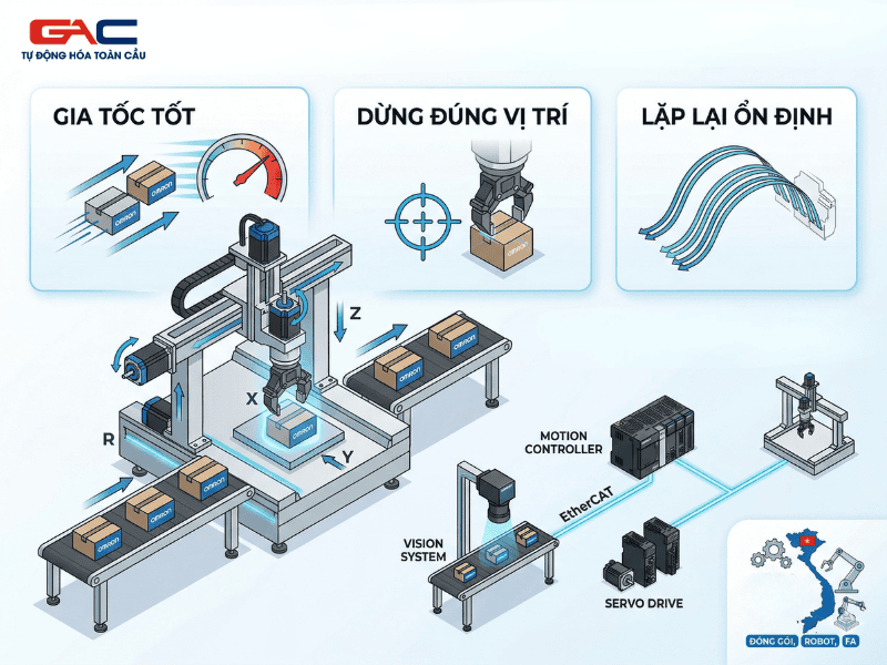 Ở robot pick and place hoặc các trục gắp đặt, servo giúp hệ thống đạt gia tốc tốt, dừng đúng vị trí và lặp lại ổn định. Nếu dùng nền tảng điều khiển Omron đồng bộ cùng vision hoặc motion controller, việc triển khai sẽ logic hơn về mặt hệ thống. Một số nguồn thị trường tại Việt Nam cũng đang nhấn mạnh Omron mạnh ở các ứng dụng đóng gói, robot và FA.