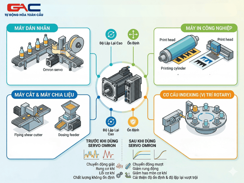 Servo Omron phù hợp với máy đóng gói, cấp liệu, cắt theo chiều dài, dán nhãn, robot pick and place, cơ cấu indexing và các hệ chuyển động cần định vị chính xác, phản hồi nhanh.