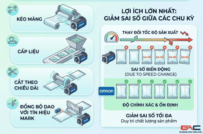 Lý do đầu tiênđộ chính xác và khả năng phản hồi. Khi máy cần cắt theo chiều dài chính xác, đồng bộ dao cắt với băng tải, kéo màng theo từng chu kỳ hay định vị trục pick and place, servo là lựa chọn gần như bắt buộc. Omron mô tả dòng servo của họ phục vụ cho điều khiển tốc độ cao và độ chính xác cao; riêng G5 được nhấn mạnh cho kết nối trực tiếp với NJ controller qua EtherCAT nhằm xây dựng hệ điều khiển máy tự động nhanh và cao cấp hơn.
