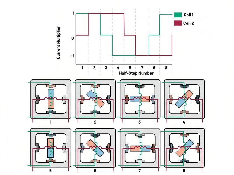 Động cơ bước hoạt động dựa trên tương tác điện từ giữa stator và rotor để tạo chuyển động góc theo từng bước rời rạc. Thiết bị định vị tọa độ thông qua các góc chia cơ học không cần mạch phản hồi phức tạp. Nguyên lý tối giản mang lại độ bền cơ học ổn định cao.