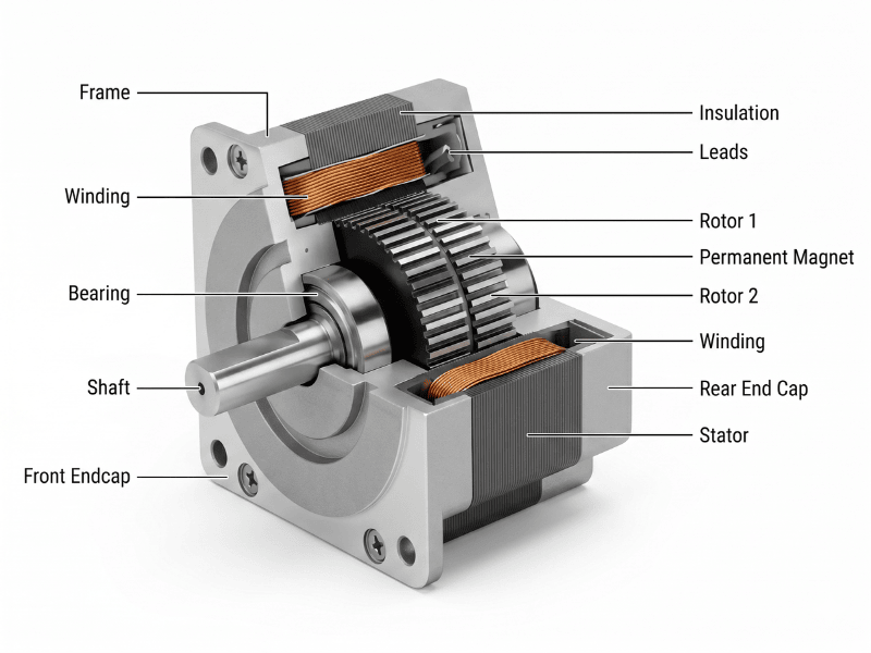 Hệ thống chuyển đổi xung điện rời rạc thành chuyển động quay qua khối stator mật độ răng đặc. Mỗi xung tín hiệu làm rotor dịch chuyển chính xác một góc bước cố định. Dung sai cơ học chế tạo máy được kiểm soát chặt chẽ.