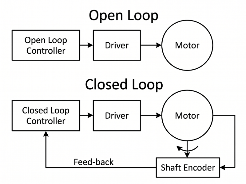 Hoạt động dựa trên chuỗi hở nên vị trí không gian được xác định qua số lượng xung điều khiển phát ra. Trình điều khiển xuất chuỗi xung tương ứng với lượng góc quay thiết lập ban đầu. Không có cơ chế phản hồi vị trí thực tế từ encoder trong cấu hình điều khiển vòng hở tiêu chuẩn.