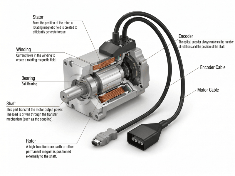 Về cấu trúc cơ bản động cơ này vẫn bao gồm khối tĩnh và khối quay. Điểm khác biệt cốt lõi là cơ chế phản hồi trạng thái cực kỳ thông minh tự động. Hệ thống nhận biết sai số định vị tức thời thông qua encoder quang dùng làm phần tử phản hồi vị trí.