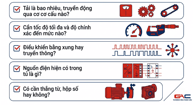 Tối thiểu nên có tải cơ khí, tốc độ yêu cầu, chu kỳ làm việc, kiểu điều khiển, điện áp nguồn, có dùng hộp số hay thắng từ không và mục tiêu chính là vị trí, tốc độ hay mô-men.