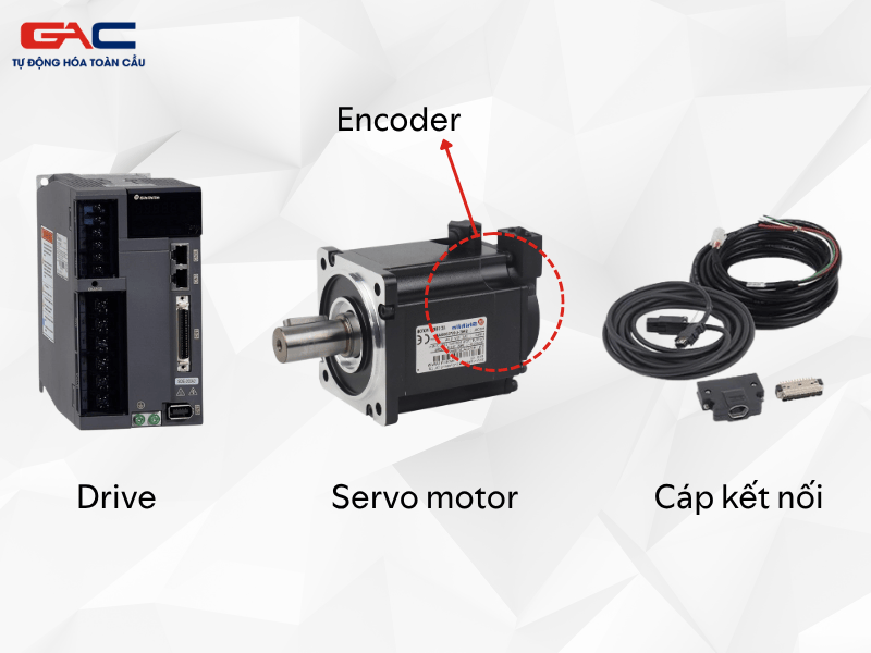 Một bộ servo thường gồm servo drive, servo motor, encoder và hệ cáp động lực – phản hồi – điều khiển. Tùy ứng dụng còn có thể có thêm thắng từ, điện trở xả hoặc hộp số.