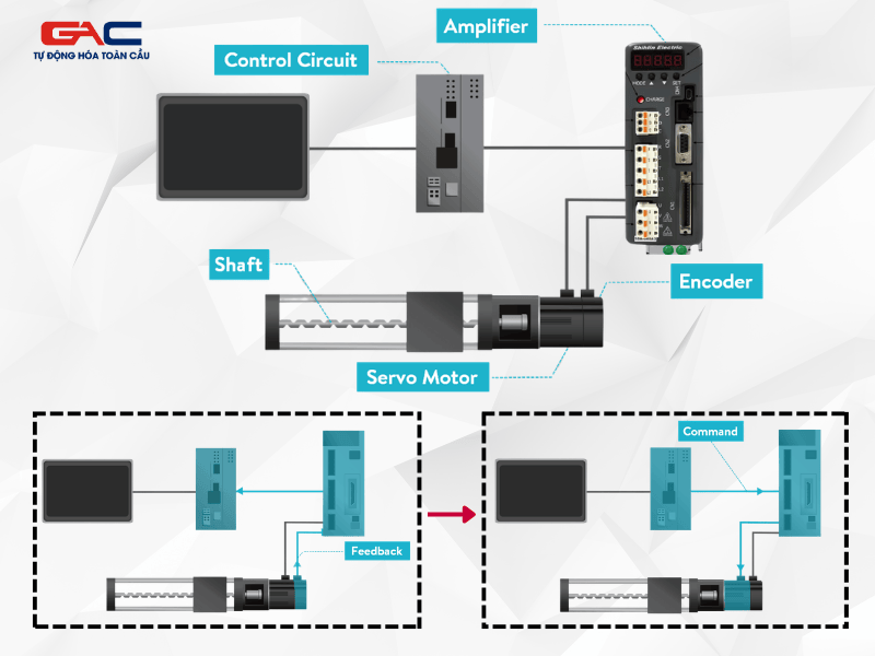 Điểm mấu chốt là điều khiển vòng kín. Khi PLC hoặc bộ điều khiển gửi lệnh vị trí, tốc độ hay mô-men, driver sẽ điều khiển motor và đồng thời so sánh liên tục giữa lệnh đặt với tín hiệu phản hồi từ encoder. Nếu có sai lệch, driver sẽ bù ngay. Nhờ vậy servo đạt độ chính xác, độ đáp ứng và khả năng ổn định cao hơn nhiều phương án truyền động thông thường.
