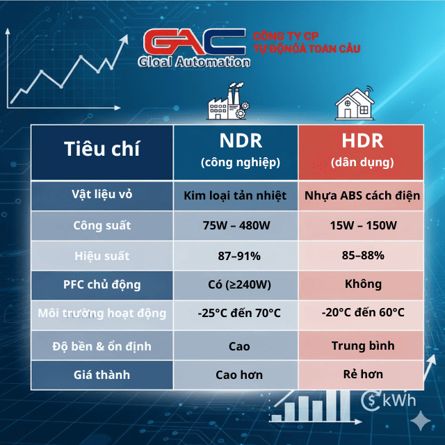 Ngược lại, HDR (Home DIN Rail Power Supply – Residential Type) hướng đến ứng dụng dân dụng và thiết bị nhỏ: