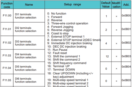 - 00 ~ F11.05 = 15 (chỉ cần chọn 1 trong các chân DI1, DI2, DI3, DI4, DI5 hoặc DI6 làm chân đầu vào mong muốn và cài giá trị =15) ; Chân chức năng để chuyển đổi qua lại giữa kênh điều khiển tần số 1 và kênh điều khiển tần số 2