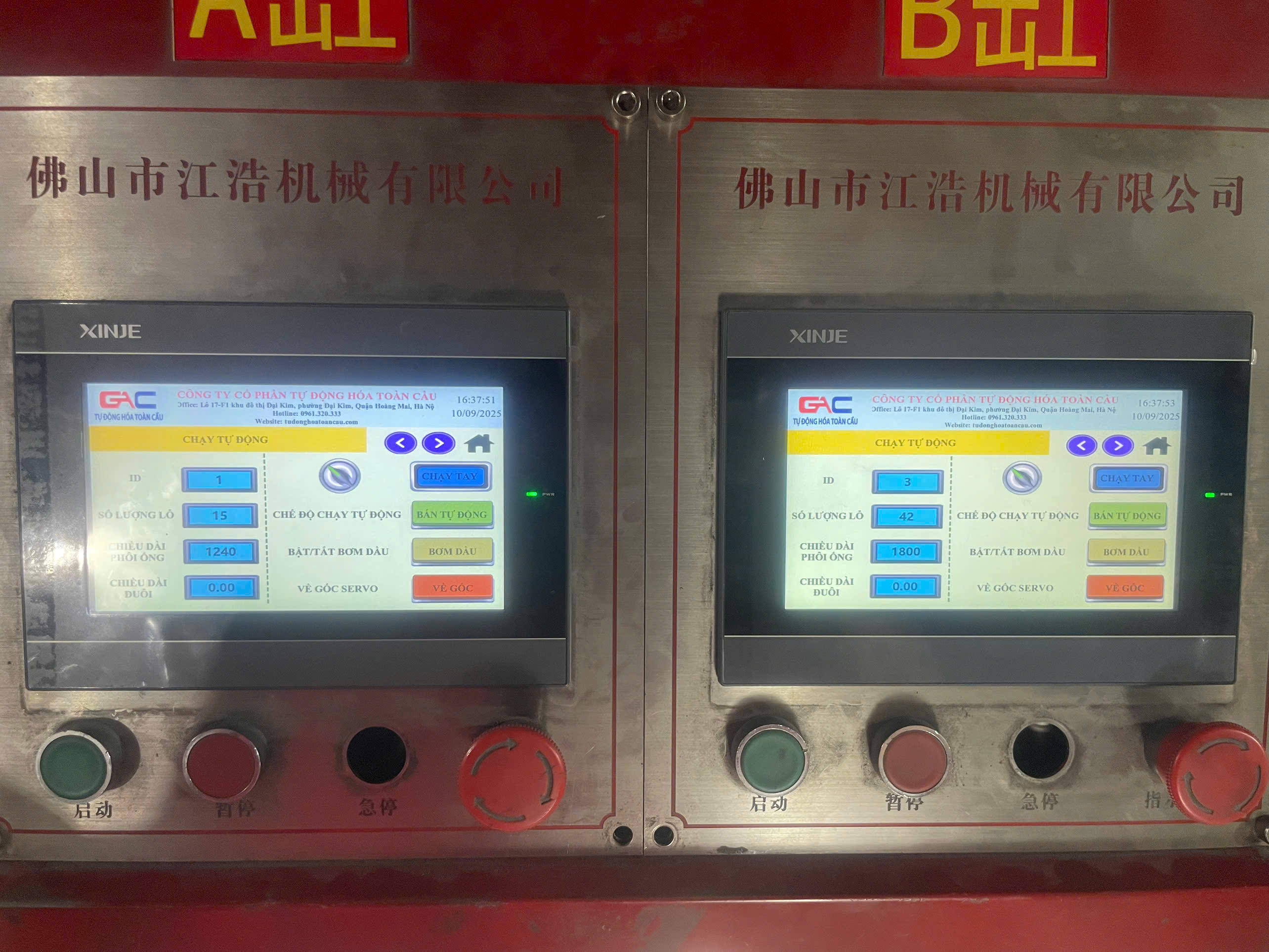 - Giao diện HMI thân thiện: Thay thế màn hình cũ bằng HMI Xinje, giúp người dùng dễ dàng thao tác và điều chỉnh các tham số cần thiết. Giao diện được lập trình bằng tiếng Việt, giúp công nhân dễ dàng sử dụng.