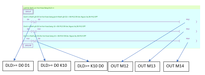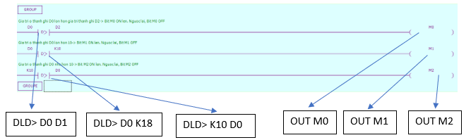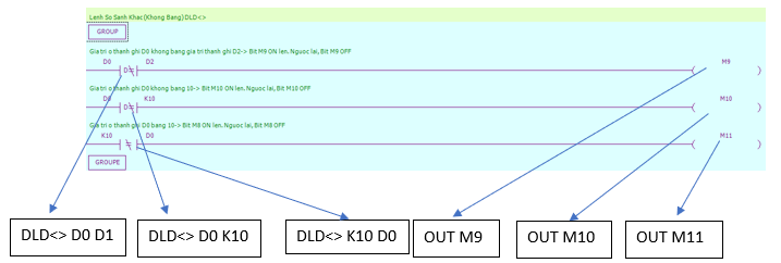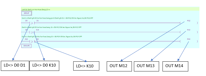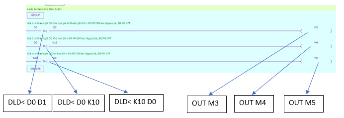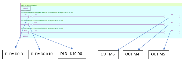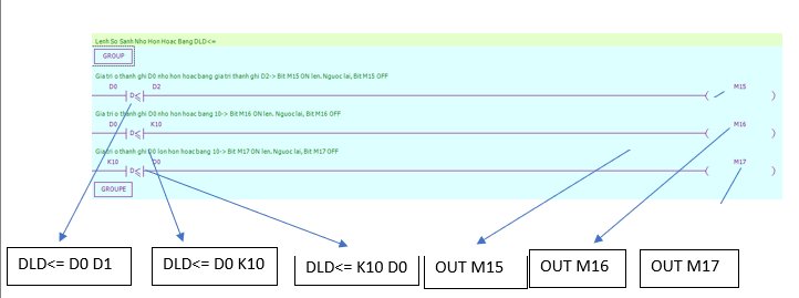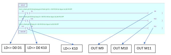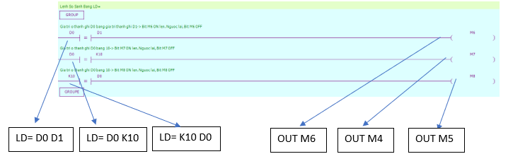 - Lệnh OUT: loại hoạt động logic cuối cùng, đầu ra cuộn coil, được sử dụng cho các biến như X,Y,M,HM,SM,S,HS,T,HT,C,HC,Dn.m.