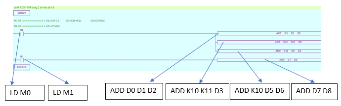 Chương trình PLC sử dụng lệnh tính tổng dữ liệu 16 bit ADD: