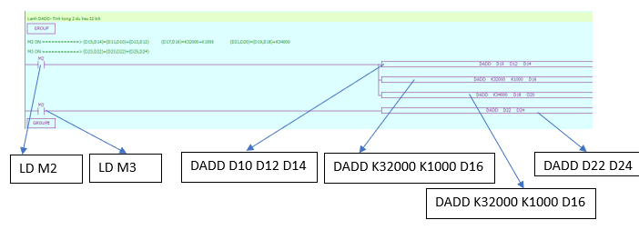 Chương trình PLC sử dụng lệnh tính tổng 32 bit DADD: