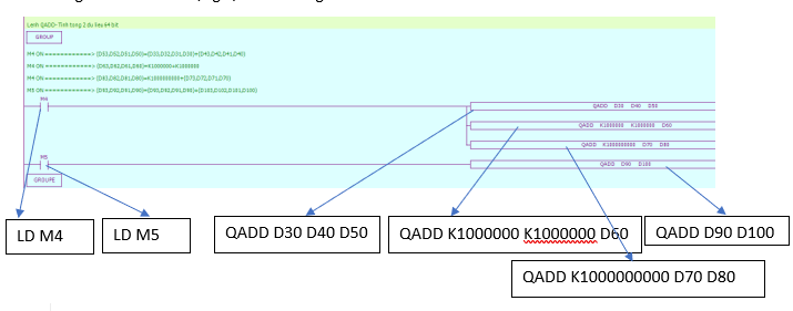 Chương trình PLC sử dụng lệnh tính tổng 64 bit QADD:
