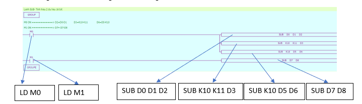 Chương trình PLC sử dụng lệnh tính tổng dữ liệu 16 bit SUB: